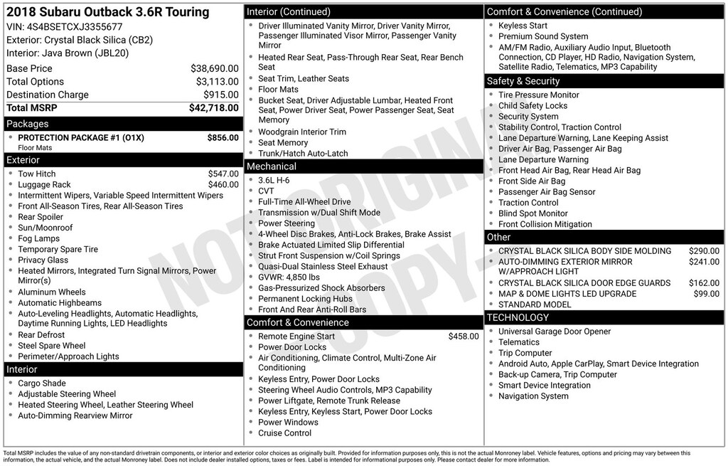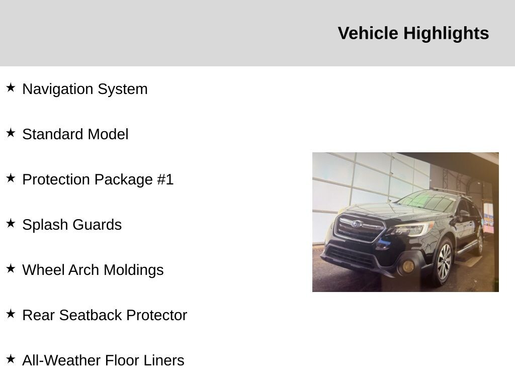 Crystal Black Silica 2018 Subaru Outback 3.6R Touring AWD CVT Lineartronic 3.6L Boxer H6 DOHC 24V All-Weather Floor Liners, Navigation System, Protection Package #1, Rear Seatback Protector, Splash Guards, Standard Model, Wheel Arch Moldings.