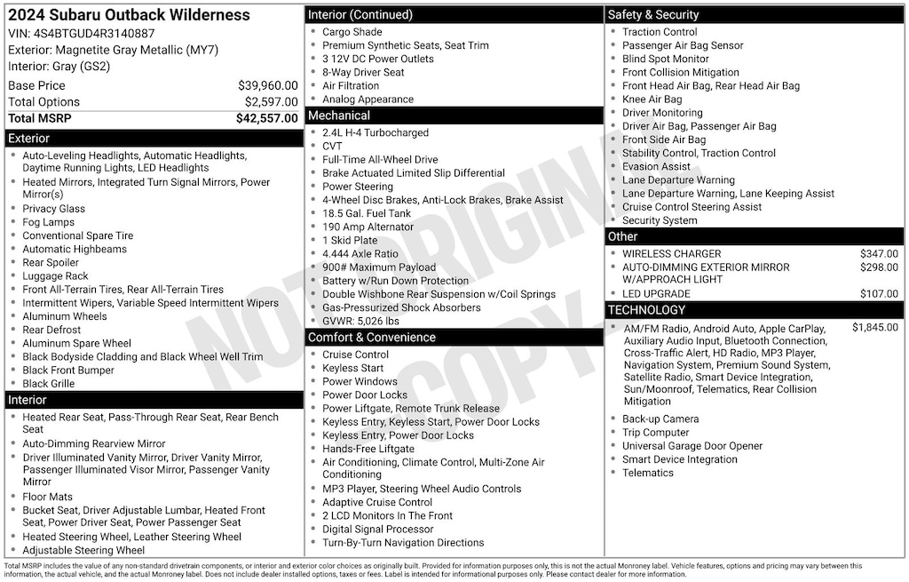 Power Moonroof & Navigation & RAB (Power Moonroof, Radio: Subaru STARLINK 11.6" Multimedia Nav System, and Reverse Automatic Braking (RAB) System), 12 Speakers, 4-Wheel Disc Brakes, 4.444 Axle Ratio, ABS brakes, Air Conditioning, Alloy wheels, AM/FM radio: SiriusXM, Auto High-beam Headlights, Auto-Dimming Exterior Mirror w/Approach Light, Auto-dimming Rear-View mirror, Automatic temperature control, Brake assist, Compass, Driver door bin, Driver vanity mirror, Dual front impact airbags, Dual front side impact airbags, Electronic Stability Control, Emergency communication system: STARLINK Safety Plus (3-year free trial), Exterior Parking Camera Rear, Four wheel independent suspension, Front anti-roll bar, Front Bucket Seats, Front Center Armrest w/Storage, Front dual zone A/C, Front fog lights, Front reading lights, Fully automatic headlights, Garage door transmitter: HomeLink, harman/kardon® Speakers, Heated door mirrors, Heated Front Bucket Seats, Heated front seats, Heated rear seats, Heated steering wheel, Illuminated entry, Knee airbag, Leather steering wheel, LED Upgrade, Low tire pressure warning, Occupant sensing airbag, Outside temperature display, Overhead airbag, Overhead console, Panic alarm, Passenger door bin, Passenger vanity mirror, Power door mirrors, Power driver seat, Power Liftgate, Power passenger seat, Power steering, Power windows, Radio: Subaru STARLINK 11.6" Multimedia Plus Sys, Rear anti-roll bar, Rear seat center armrest, Rear window defroster, Rear window wiper, Remote keyless entry, Roof rack, Security system, Speed control, Speed-sensing steering, Split folding rear seat, Spoiler, StarTex-Trimmed Upholstery, Steering wheel mounted audio controls, Tachometer, Telescoping steering wheel, Tilt steering wheel, Traction control, Trip computer, Turn signal indicator mirrors, Variably intermittent wipers, Wheels: 17" x 7J Matte Black Aluminum-Alloy, and Wireless Charger. Recent Arrival! 21/26 City/Highway MPG