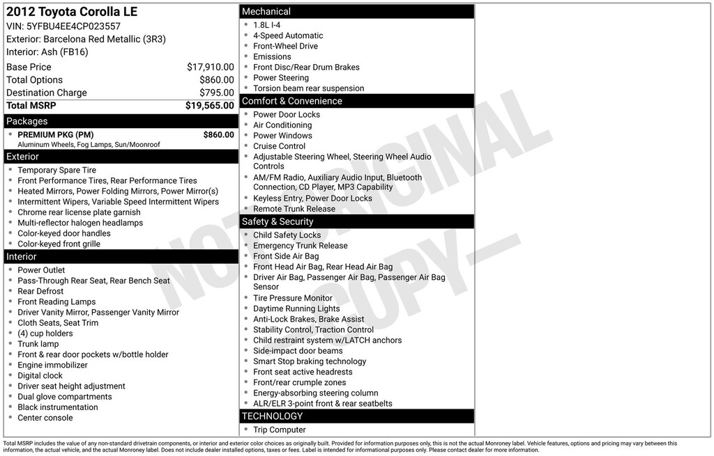 Barcelona Red Metallic 2012 Toyota Corolla LE FWD 4-Speed Automatic 1.8L I4 DOHC Dual VVT-i