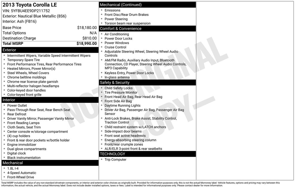 6 Speakers, 6.5" x 16" Steel Wheels, ABS brakes, Air Conditioning, AM/FM radio, AM/FM/CD Player w/MP3/WMA Capability, Anti-whiplash front head restraints, Brake assist, Bumpers: body-color, CD player, Driver door bin, Driver vanity mirror, Dual front impact airbags, Dual front side impact airbags, Electronic Stability Control, Fabric Seat Trim, Front anti-roll bar, Front Bucket Seats, Front Center Armrest, Front reading lights, Front wheel independent suspension, Heated door mirrors, Illuminated entry, Low tire pressure warning, Occupant sensing airbag, Outside temperature display, Overhead airbag, Panic alarm, Passenger door bin, Passenger vanity mirror, Power door mirrors, Power steering, Power windows, Radio data system, Radio: Display Audio w/Navigation & Entune, Rear anti-roll bar, Rear window defroster, Remote keyless entry, Speed control, Speed-sensing steering, Split folding rear seat, Steering wheel mounted audio controls, Tachometer, Telescoping steering wheel, Tilt steering wheel, Traction control, Trip computer, and Variably intermittent wipers. Recent Arrival! 26/34 City/Highway MPG