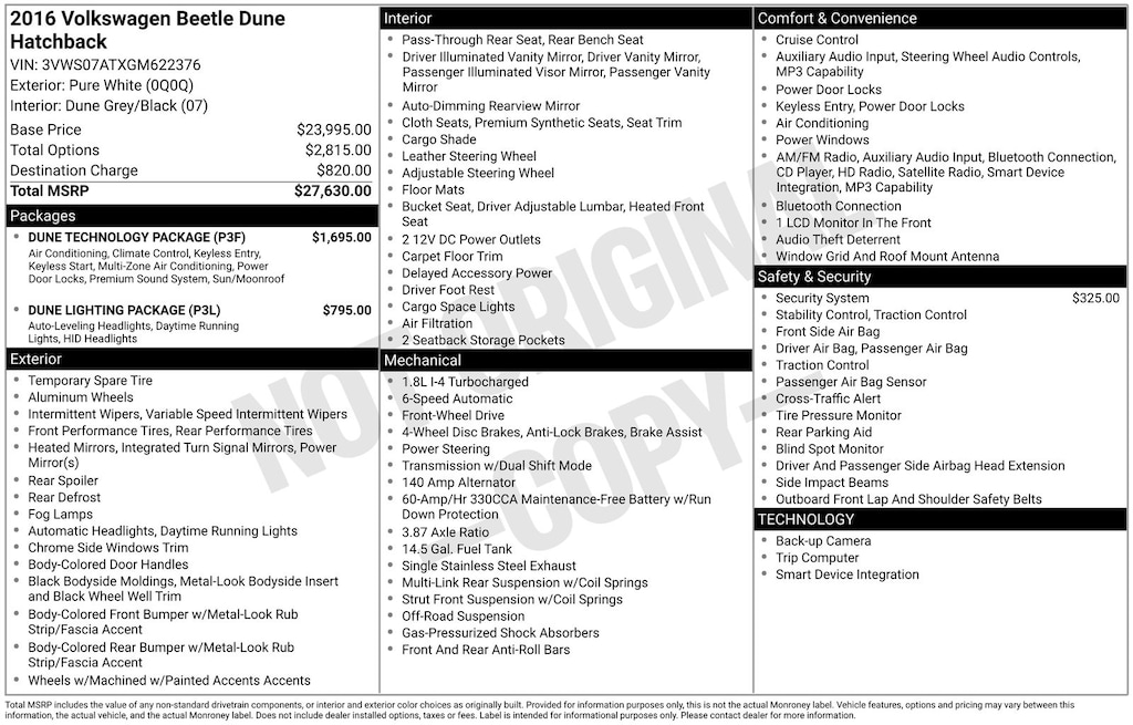 Pure White 2016 Volkswagen Beetle 1.8T Dune FWD 6-Speed Automatic 1.8L I4 Turbocharged DOHC 16V ULEV II 170hp Dune Grey/Black Cloth.