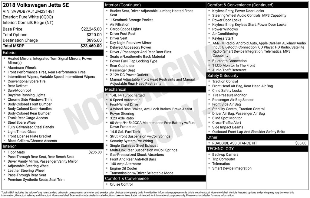 Cornsilk Beige Premium Synthetic, 4 Speakers, 4-Wheel Disc Brakes, ABS brakes, Air Conditioning, Alloy wheels, AM/FM radio: SiriusXM, Brake assist, Bumpers: body-color, CD player, Driver door bin, Driver vanity mirror, Dual front impact airbags, Dual front side impact airbags, Electronic Stability Control, Emergency communication system: VW Car-Net, Exterior Parking Camera Rear, Four wheel independent suspension, Front anti-roll bar, Front Bucket Seats, Front Center Armrest, Front reading lights, Heated door mirrors, Heated Front Comfort Seats, Heated front seats, Heavy Duty Trunk Liner w/VW CarGo Blocks, Illuminated entry, Leather Shift Knob, Low tire pressure warning, Monster Mats w/Logo Rubber Mat Kit (Set of 4), Occupant sensing airbag, Outside temperature display, Overhead airbag, Overhead console, Panic alarm, Passenger door bin, Passenger vanity mirror, Power door mirrors, Power moonroof, Power steering, Power windows, Radio data system, Radio: Composition Media w/6.3" Touchscreen, Rear anti-roll bar, Rear reading lights, Rear seat center armrest, Rear window defroster, Remote keyless entry, Roadside Assistance Kit, Speed control, Speed-sensing steering, Split folding rear seat, Steering wheel mounted audio controls, Tachometer, Telescoping steering wheel, Tilt steering wheel, Traction control, Trip computer, Turn signal indicator mirrors, V-Tex Leatherette Seat Trim, Variably intermittent wipers, and Wheels: 16" Sedona Black Alloy. Recent Arrival! 28/38 City/Highway MPG